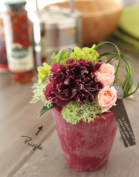 説明 カラフルな色合いが愛らしい、こちらのアレンジは、可愛さの中にもスタイリッシュな要素を組み込んだ カジュアルなデザインです。 小ぶりなサイズですが、その存在感は大きく、一目で 惹きつけられる華やかさと、アクセントとなる黒いボ タンタグ、ほのかに香るアロマ花器が特徴です。