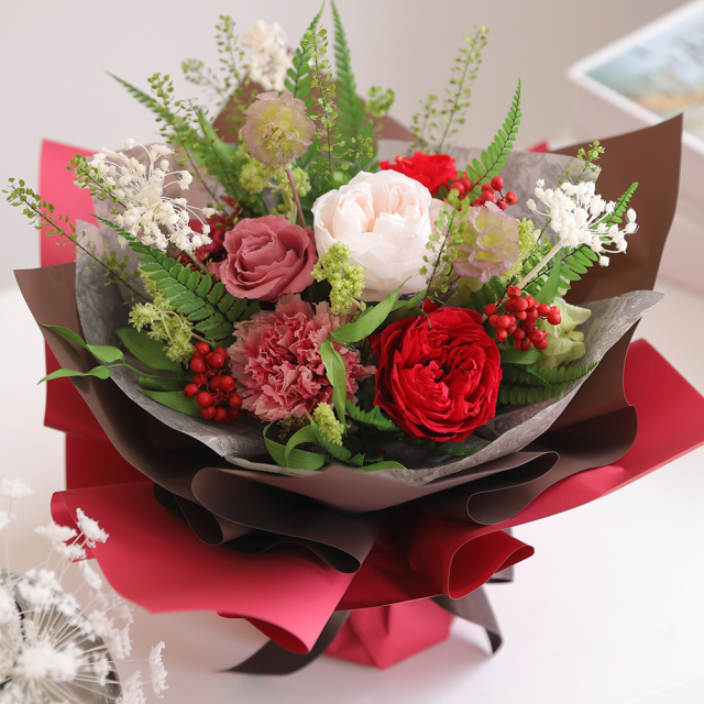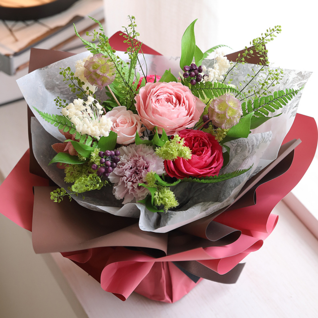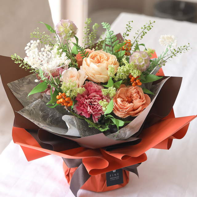 洗練されたデザインの「枯れないブーケ」は、晴れやかなお祝いシーンの贈り物としてお勧め。