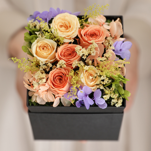 FiNEのボックスは、上部に空間を設けて、ボックスから溢れるようにお花をアレンジすることができます。生き生きとしたグリーンや小花と、ローズに高低差をつけた立体感のあるアレンジは、ボックスの蓋を開けると、誰もが思わず笑みがこぼれます。