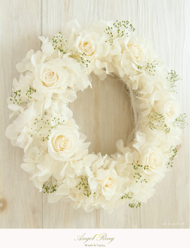 説明 まるで天使が舞い降りてきたような、優しいホワイトリース。ふんわり紫陽花リースの上に、ちりばめられたホワイトローズが華やかさを出してくれます。純白ではなくアイボリーホワイトで、心を和ませてくれるそんな素敵なリースです。