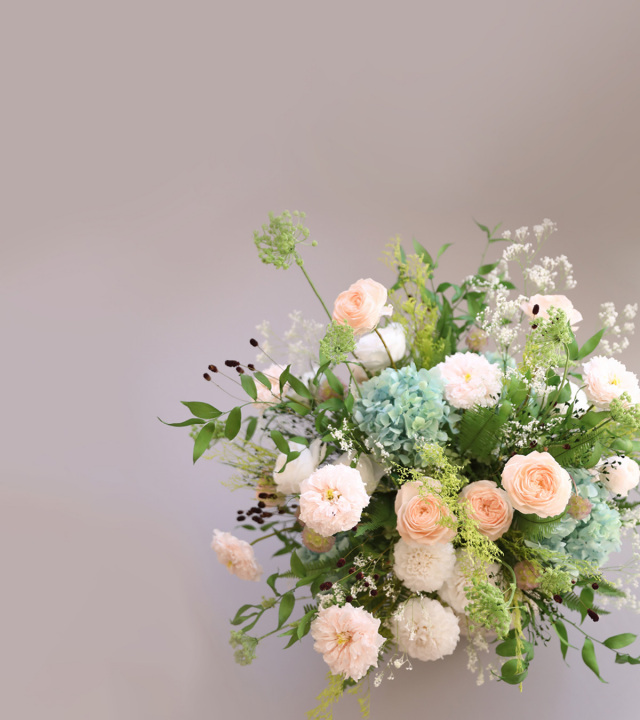 | ダリア、ローズ、ステンクーゲル、山シダ、グリーンミスト、アジサイ、カスミソウ、カスピア、イタリアンルスカス(プリザーブド)ワレモコウ(ドライ) |