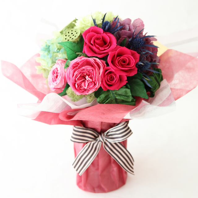 ・プリザーブドフラワーは生花を加工して作られているため、 製造ロットによって大きさ・お色・質感などが異なります。
