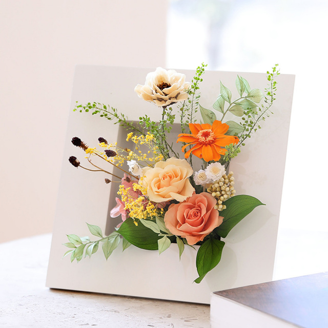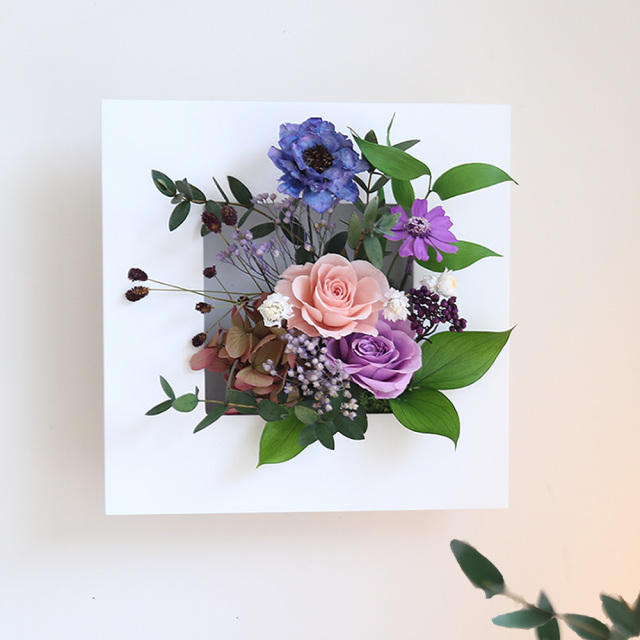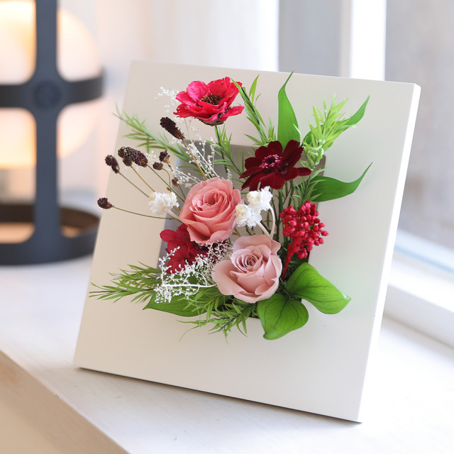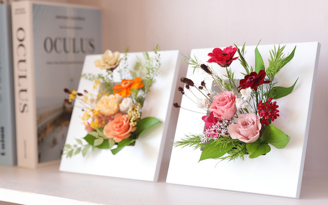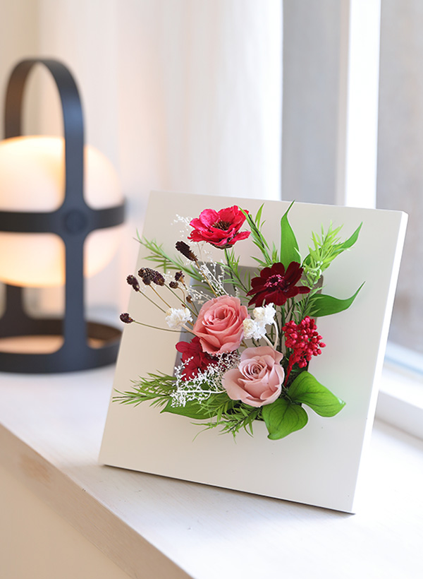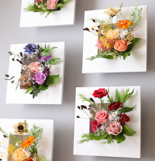 立体的に配したお花やグリーンが、空間に躍動感を添える「スタンド・壁掛けの2Way」が嬉しいフレームフラワー