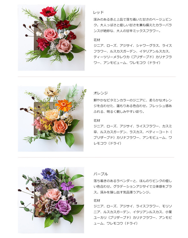 レッド:ジニア、ローズ、アジサイ、シャワーグラス、ライスフラワー、ルスカスガーデン、イタリアンルスカス、ティーツリーメラレウカ(プリザーブド)カリナフラワー、アンモビューム、ワレモコウ(ドライ)
