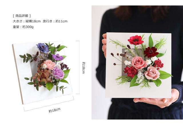 ・プリザーブドフラワーは生花を加工して作られているため、 製造ロットによって大きさ・お色・質感などが異なります。