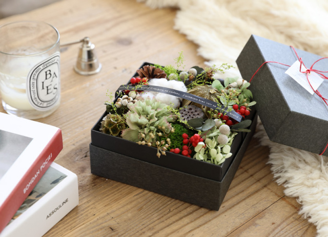 | ドライの木の実とアンニュイなカラーのプリザーブドフラワーをたっぷり詰め込んなおしゃれな 季節限定のボックスアレンジ |