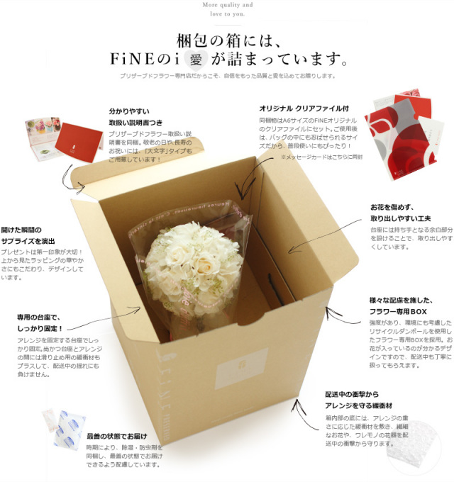 ・プリザーブドフラワーは生花を加工して作られているため、 製造ロットによって大きさ・お色・質感などが異なります。